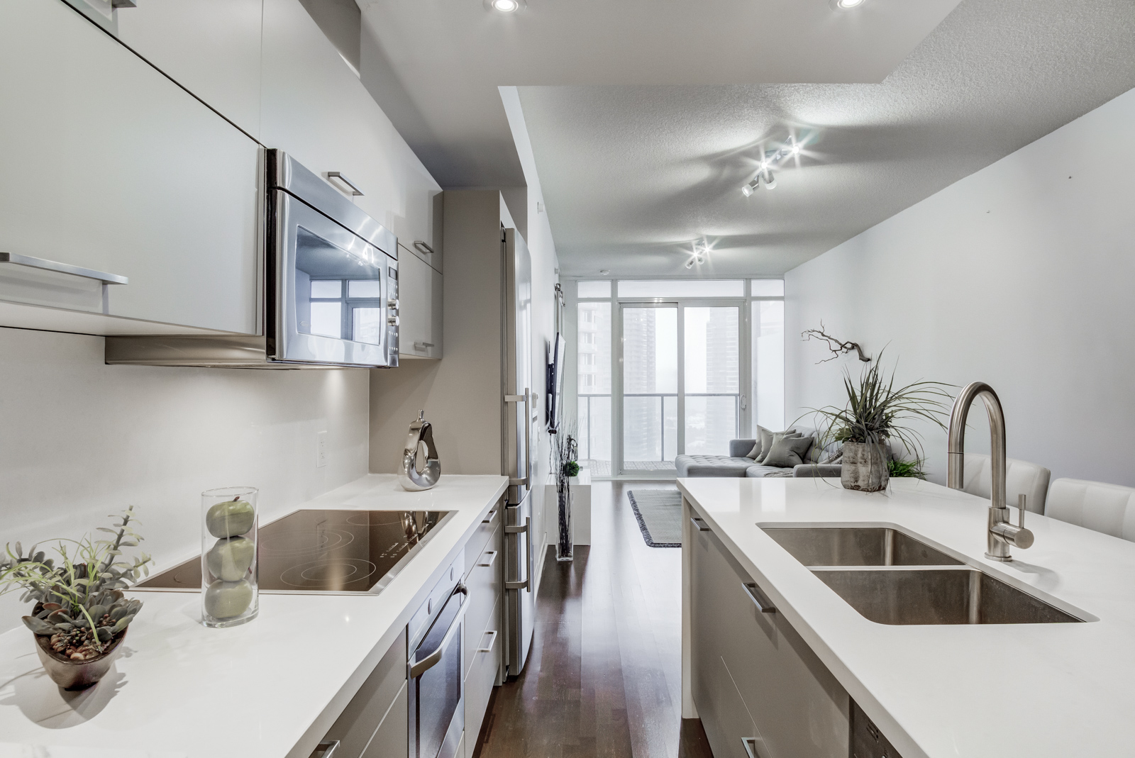 Stunning kitchen with custom coloured cabinets, upgraded quartz counters, pot lights & undermount lighting