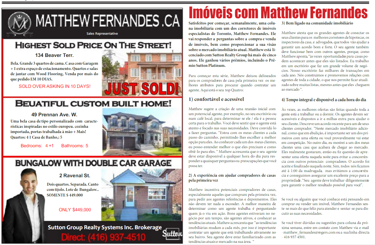 We’re excited to begin a weekly real estate column featuring one of Toronto’s expert realtors, Matthew Fernandes. He will answer questions regarding buying and selling properties, as well as provide his insight into the current real estate market. Matthew has been licensed with Sutton Group Realty for over six years. He has won multiple awards, including the Sutton Platinum Award.